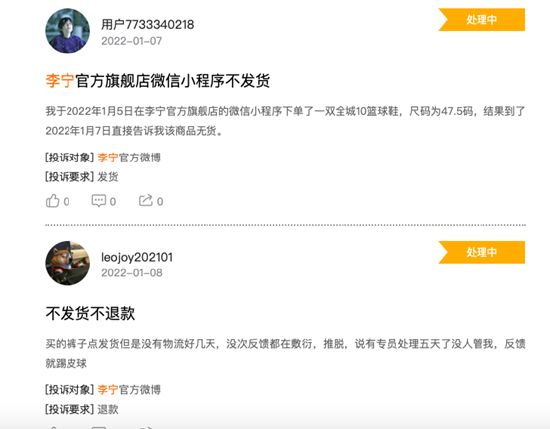 此外,新浪科技从黑猫投诉平台了解到,近期多位平台用户反馈在李宁官方渠道购买的衣服和鞋子逾期不发货,且相关订单被标注为订单异常,客服不处理问题态度敷衍,有些还以订单异常为由要求消费者自己退款。