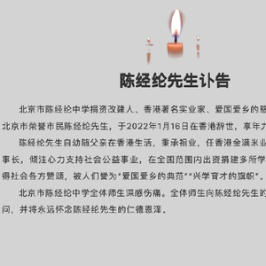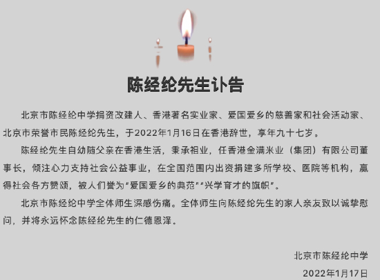 1月17日,“北京市陈经纶中学”微信公众号发布讣告,北京市陈经纶中学捐资改建人、香港著名实业家、爱国爱乡的慈善家和社会活动家、北京市荣誉市民陈经纶先生,于2022年1月16日在香港辞世,享年九十七岁。