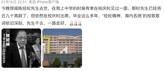 陈经纶辞世的消息传出后,不少陈经纶中学的校友在网上纷纷追悼陈老先生。有校友回忆起与陈经纶的见面,“在我上中学的时候有幸在校庆时见过一面,那时先生已经将近九十高龄了,但依然在校庆时出席。毕业这么多年,‘经纶精神,海内名扬’的校歌歌词依旧深刻,先生千古,一路走好。”也有校友表示,“对他(陈经纶)最初的了解就是学校教学楼的名字。”