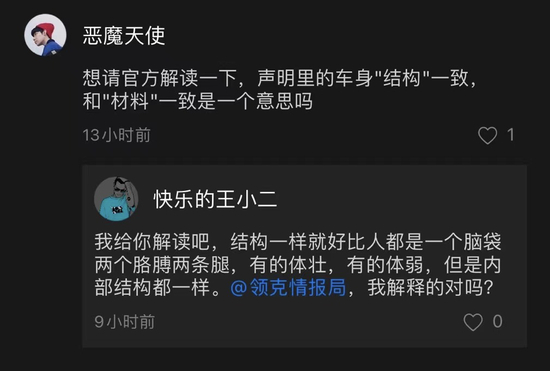 言外之意,领克官方并不认为存在虚假宣传,而是因为车身钢结构示意标准不统一而导致的问题。不过,对于领克官方的这一解释,很多车主并不买账,例如回应文件中只提到了“结构一致”,但是部分车主看来,“结构一致”并不代表“材料一致”。