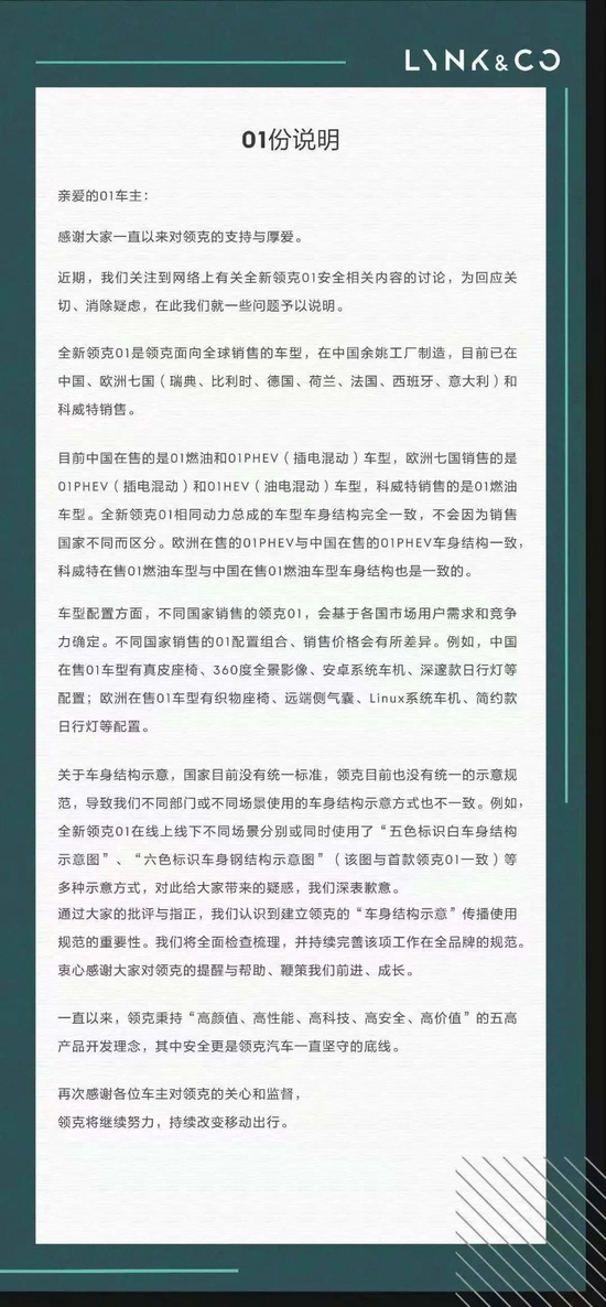 1月19日,领克汽车作出回应:”全新领克01是领克面向全球销售的车型,目前中国在售的是01燃油和01 PHEV车型,欧洲七国(瑞典、比利时、德国、荷兰、法国、西班牙、意大利)销售的是01 PHEV和01 HEV车型,科威特销售的是01燃油车型,其中相同动力总成的车型车身结构完全一致,不会因为销售国家不同而区分”。