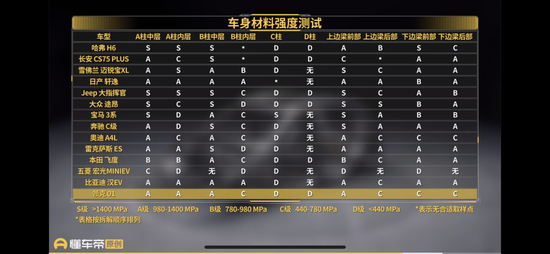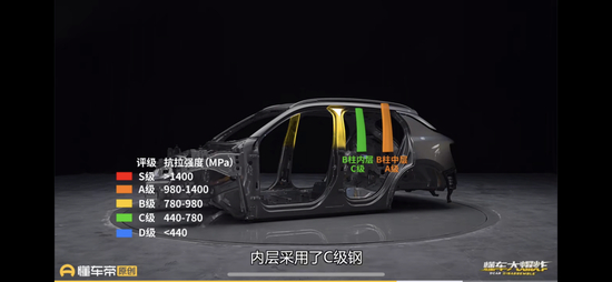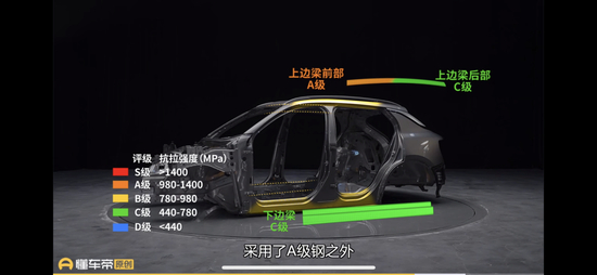 在此之前,即2021年5月23日,懂车帝旗下《懂车大爆炸》节目对领克01车身进行拆解,拆解的是领克01最低配车型。其中,在车身材料强度方面,懂车帝对不同强度的钢材做了划分。具体部位来看,领克01的A柱两层主要结构均为A级钢,实测两层结构的抗拉强度超过1300兆帕,虽然实测数据没有达到S级钢的标准,但两层材料贴近S级钢的数值范围。B柱中层采用A级钢,内层采用C级钢,C柱、D柱都是D级钢。边梁部分,领克01的上下边梁,除了上边梁前部采用A级钢之外,其余部分均为C级钢。