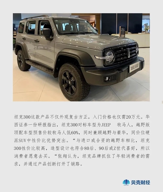 坦克300这款产品不仅外观复古方正,入门价格也仅需20万元。华西证券一份研报指出,坦克300对标车型为JEEP 牧马人,越野版顶配车型预售价较牧马人低60%,同时兼顾越野与豪华,同价位硬派SUV中性价比优势突出。