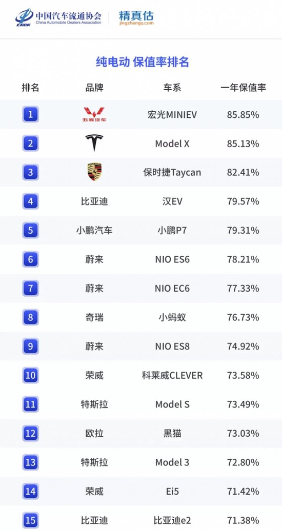 三、纯电动汽车一年保值率排名中,五菱宏光MINI EV以85.85%的保值率超越特斯拉Model X,位居榜首,排名第三的是保时捷taycan,一年保值率为82.41%;一年保值率排名4-10位的分别是比亚迪汉EV、小鹏P7、蔚来ES6、蔚来EC6、奇瑞小蚂蚁、荣威科来威。值得一提的是,在中国电动汽车市场销量排名前三的特斯拉Model 3一年保值率仅为72.8%,排名第12位。