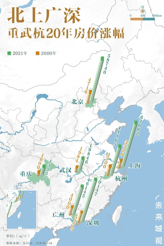 2000-2021年七大城市20年房价涨幅对比