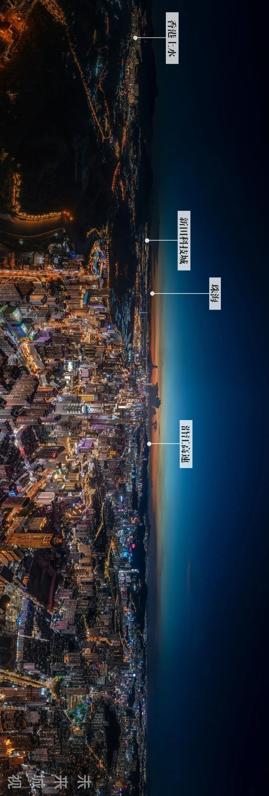 深圳的灯火与香港、珠海、东莞,星点相连,绵延不绝。摄影师@胡潇。