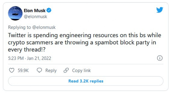 对此,特斯拉CEO马斯克发布了这项新功能的截图,称该功能“烦人”,并表示:“推特将工程资源花费在这上面,而加密货币诈骗犯却几乎在每个帖子都搞了个垃圾邮件封锁派对。”