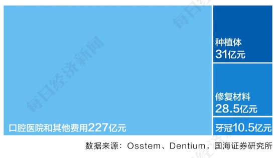 这要从种植牙服务的收费类目说起。如前文表述,在种植牙所需的耗材中,种植体并不是唯一所需的耗材。太平洋证券研究报告显示,在种植牙手术的费用构成中,核心材料种植体、基台、牙冠,以及修复材料等耗材的费用占比达到75%,其中,种植体费用占据一半;总费用中余下的25%则为治疗费。按该比例计算,如果患者进行一次种植牙服务支付的总费用为1万元,其中2500元为治疗费,耗材费用为7500元,其中种植体的费用约为3750元。