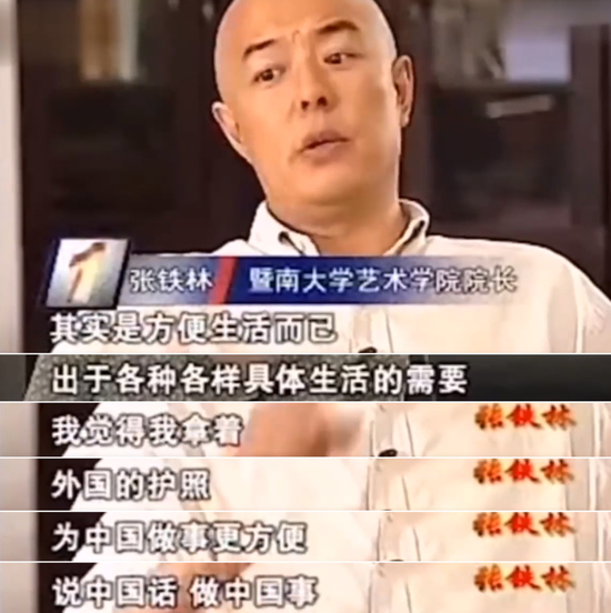 后来接受专访时,他也被问到相关问题。时任暨南大学艺术学院院长的张铁林说,无论是贷款、旅游,还是工作,那个年代拿着外国护照在各方面都很便利。话锋一转,他又表示,“我觉得我拿着外国护照为中国做事更方便,说中国话,做中国事,弘扬中国的东西。”