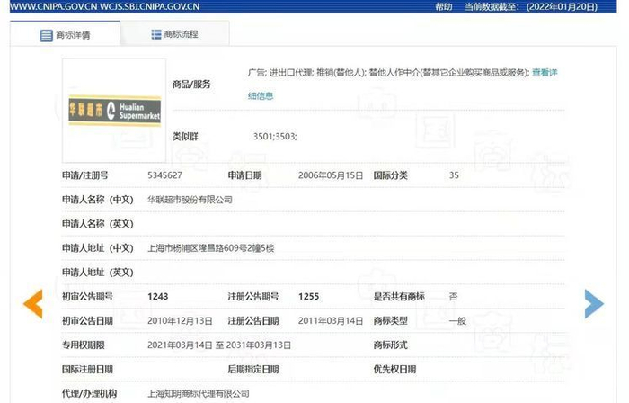 据国家知识产权局商标局、中国商标网显示,该公司于2006年、2007年分别申请注册了两个35类“华联超市”相关商标,其核定服务项目包括:推销(替他人)、替他人作中介(替其它企业购买商品或服务)、开发票、广告等。