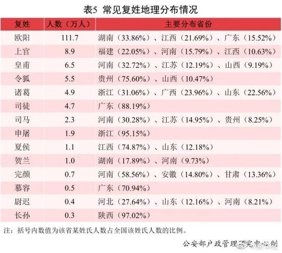 常见复姓“聚居”的特点非常突出,复姓人口在个别省份的分布较为集中。如,复姓“欧阳”33.86%的人口分布在湖南;复姓“上官”22.05%的人口分布在福建;复姓“皇甫”32.72%的人口分布在河南;复姓“令狐”75.60%的人口分布在贵州;复姓“诸葛”31.06%的人口分布在浙江;复姓“司徒”88.19%的人口分布在广东。