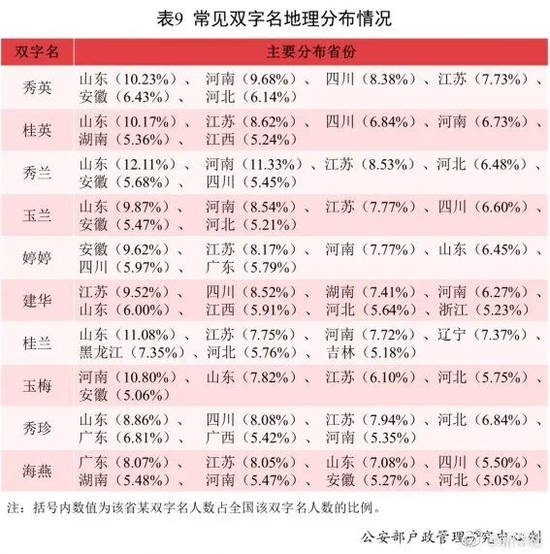 报告显示,5.24%的“桂英”分布在江西;5.79%的“婷婷”、6.81%的“秀珍”、8.07%的“海燕”分布在广东;5.91%、5.23%的“建华”分布在江西和浙江;7.37%、7.35%、5.18%的“桂兰”分布在辽宁、黑龙江和吉林;5.42%的“秀珍”分布在广西。