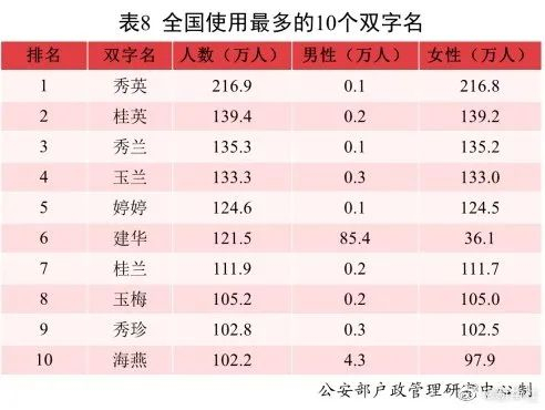 全国使用频率最高的10个双字名:全国有216.9万名秀英