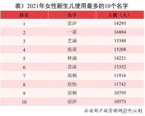 2021年出生并已经进行户籍登记的女性新生儿中,使用频率最高的10个名字依次为:若汐、一诺、艺涵、依诺、梓涵、苡沫、雨桐、欣怡、语桐、语汐。其中“若汐”使用人数达到1.8万,登顶榜首,成为女性新生儿名字首选。