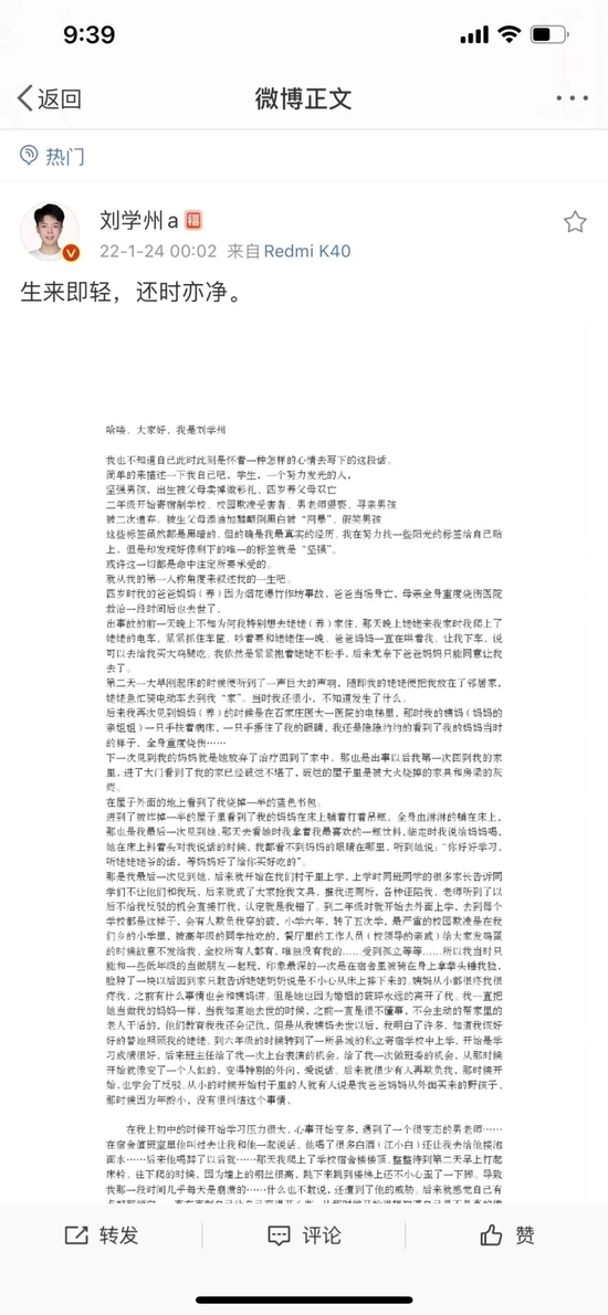 几乎同时,他的微博账号@刘学州a 更新了一封7000多字的长文,留下了“生来即轻,还时亦净”的诀别之言。