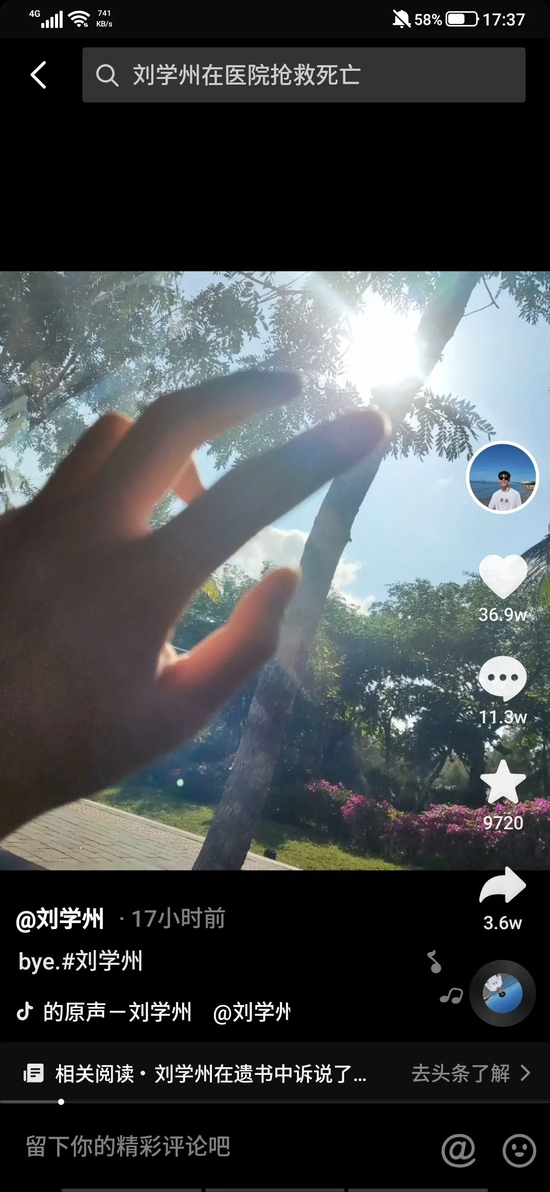 在抖音上,他发了一张用手指触摸阳光的图片,配文“bye”,与这个世界告别。