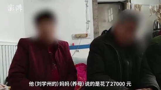 1月24日,刘学州的姥姥在接受澎湃新闻采访时承认,他们一家出了2.7万元从刘学州亲生父母处将他买来。“(生父母收到了)6000块是因为中间人。”