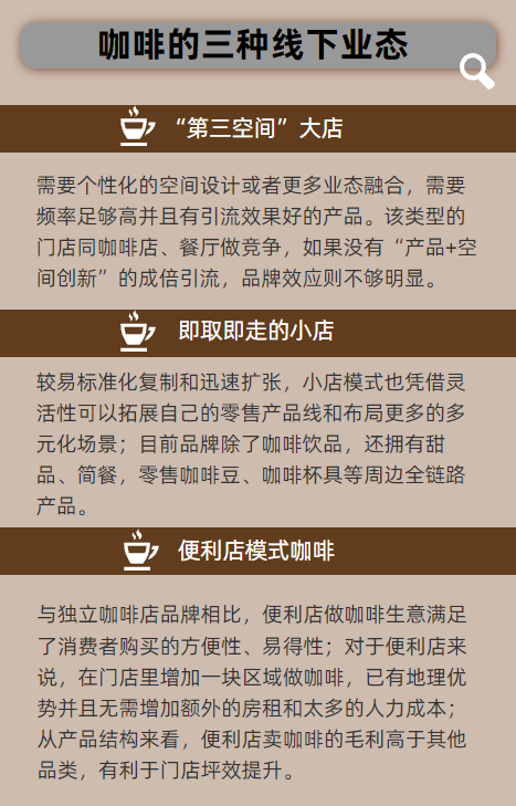 青桐资本投资副总裁陈蕙琳分析认为,在线下业态方面,可分为三种,即“第三空间”大店、即取即走的小店,以及便利店模式咖啡。