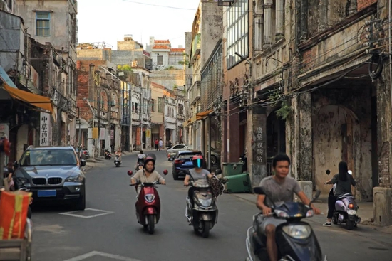 不过,这种过马路的方式,在这座名为徐闻的小县城里倒很常见。这是一座看起来不太“现代化”的城市,建筑物大多陈旧,至今未通高铁,从距离它最近的“大城市”湛江出发,要坐两个小时的大巴才能到达。一下大巴车,七八辆摩托车就会围在你身边。戴着各色头盔的司机用方言热情地说着什么,虽然听不懂,大概也能猜得到是“去哪里”和“坐不坐摩托”。