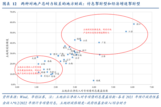 腾冲财政的数字刺眼,但其土地财政难题具有普遍性。展望2022,哪些地方财政对地产忍耐力较差、最可能率先放松地产政策?我们理解地产下行对地方财政的威胁主要有两点:一是卖地收入中占约20%的净收入是地方专项债付息的主要来源,利息覆盖倍数较低的地方或有流动性风险;二是稳增长背景下,部分经济增长任务较重的地方或有增速不达标风险。我们对应选取了专项债付息和经济增速两条底线,分别划定了付息掣肘型(土地出让净收入对专项债利息覆盖倍数较低)的天津、云南等9省和经济增速掣肘型(土地出让金下滑对全省/全国名义GDP增速拖累较大)的浙江、江苏等6省财政对地产忍耐力较差。若地产冲击持续,这些省份或将率先放松地产政策,或可视作全国地产政策进一步放松的信号(见图表12)。