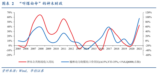 神木财政收入为何高增?2021年财政预算调整报告中,神木财政局将“受煤炭价格变化较大导致收入增幅较大”列为首要原因。回溯其历年预算草案,可见煤炭价格对神木财政的意义之大(见图表1)——煤炭行情不好的年份,神木“煤炭一发烧,财政就感冒”;2021年神木所在市榆林的动力煤均价接近翻倍,成就了神木的“煤价发烧,财政吃饱”。