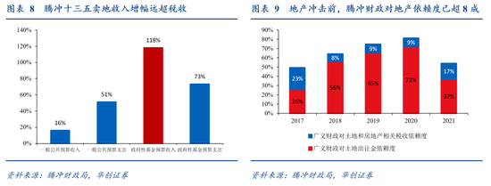 腾冲财政8成依赖地产,使其完全暴露在土地市场风险之下:“十三五”腾冲政府性基金预算收入(9成是卖地)增幅高达118%,而一般公共预算收入(8成是税收)仅增长16%、大部分也由地产相关税收贡献:五项地产相关税收在腾冲税收中占比高达约4成,其中契税单项占比就由2017年的7%升至2020年的20%同年,腾冲房地产投资增速加速冲顶,单年同比增长49%,占5年来投资总额的42.1%2021年地产冲击前,地产相关税收+卖地收入在腾冲广义财政收入中的占比已高达81%
