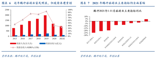 疫情以来腾冲支柱产业——旅游业全面萎缩,主因是边境疫情。疫情发生前,腾冲旅游总收入四年接近翻两番,由2015年的66亿升至2019年的242亿,旅游总收入/GDP最高时曾达94.2%疫情发生以来,位于中缅边境的腾冲屡遭边境疫情侵扰,旅游业遭受重创:2021年旅游人次较2019年腰斩;旅游总收入不足百亿、不到2019年的40%景区门票收入、饭店床位出租率、机场客座率等细项指标在2020年低基数之上仍全面负增。