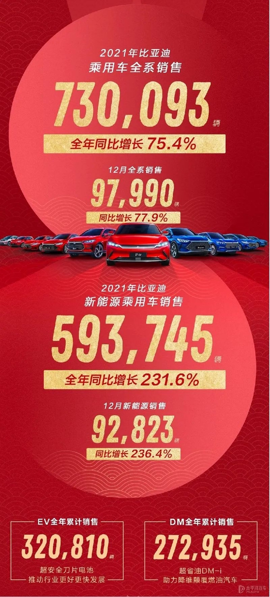 2021年,比亚迪乘用车全年销量为730,093台,同比增长75.4%,其中新能源车销量为593,745台(纯电动车销量为320,810台,DM插电式混动车型销量为272,935台),同比增长231.6%。光12月份比亚迪新能源车销量为92,823台,同比增长236.4%。