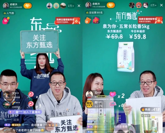 2021年12月28日晚上8点,新东方创始人俞敏洪出现在抖音直播间,开启首场直播带货卖农产品。在俞敏洪上线后,直播间粉丝人数迅速上升到2万人以上。电商与直播大数据平台“飞瓜”显示,截至12月28日直播结束,“东方甄选”共上架商品47件,销售额为58.9万元;俞敏洪直播间上架商品31件,销售额为460.4万元。