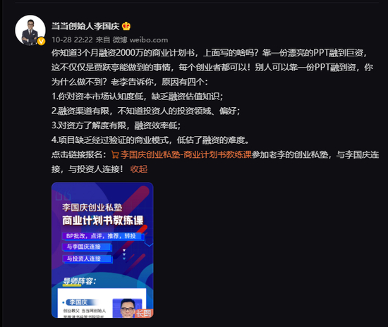除了直播带货,李国庆在2021年年底还开始了卖课之路。根据他在微博上发布的商业计划书教练课,每个创业者都可以靠PPT融资。课程9990元一人,限50人。导师晚宴限20人,费用另计。