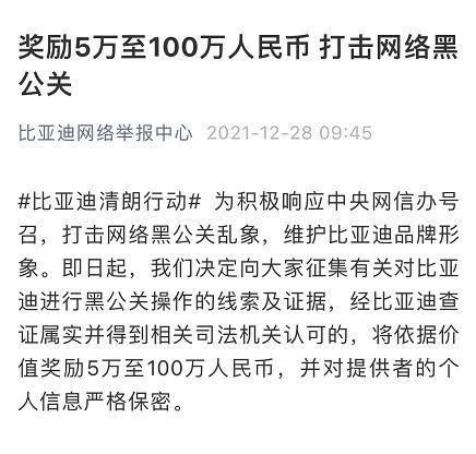 与王传福个人的指点江山相比,比亚迪在2021年除了业绩还不错之外,也引发了不少争议,比如2021年12月28日百万悬赏“黑公关”,以及之前在宣传稿中将颇有争议的卢克文称为“当代鲁迅”。