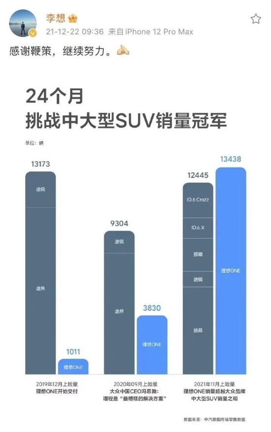 而当年理想汽车恰好刚刚推出增程式车型,李想似乎对这件事也格外“记仇”。2021年年终销量榜单出来后,李想在微博上发出一张销量数据图,内容为感谢鞭策,继续努力,并配上了理想ONE自2019年12月交付至今三年与大众旗下中大型SUV的销量对比图。