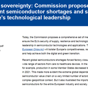 2021年7月,欧盟委员会启动了处理器和半导体工业联盟,目的是确定目前微芯片生产方面的差距,以及公司和组织(无论其规模大小)蓬勃发展所需的技术发展。