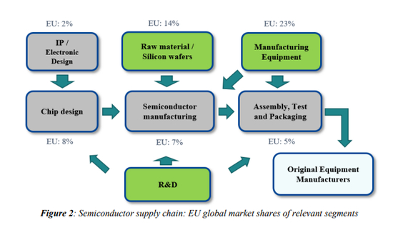 其次,半导体制造需要专业供应商为制造过程的每个阶段提供大量独特的材料、化学品和精密设备。欧洲拥有世界领先的设备和原材料供应商。在这部分供应链中,某些欧洲制造设备厂商在各自的细分市场中非常强大,以至于如果没有欧盟制造的设备,例如EUV光刻机,世界上任何先进的芯片都无法生产。