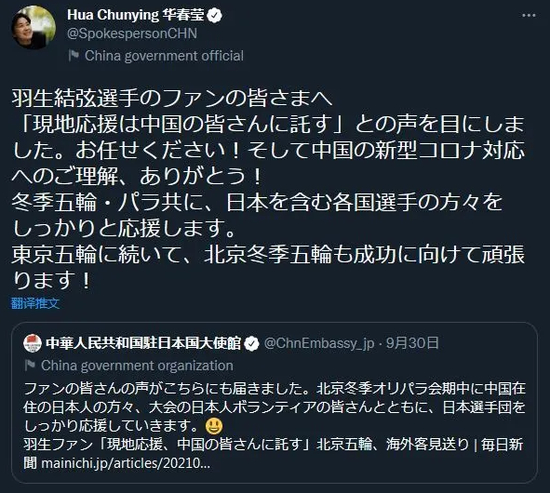 去年10月1日,在宣布北京冬奥会及冬残奥会不面向境外观众售票后,中国外交部发言人华春莹如此转发中国驻日本大使馆的推文,“写给羽生结弦粉丝们,我看到(有日本民众)发声:‘现场加油,就拜托中国观众了’。(我想说)交给(我们)!”