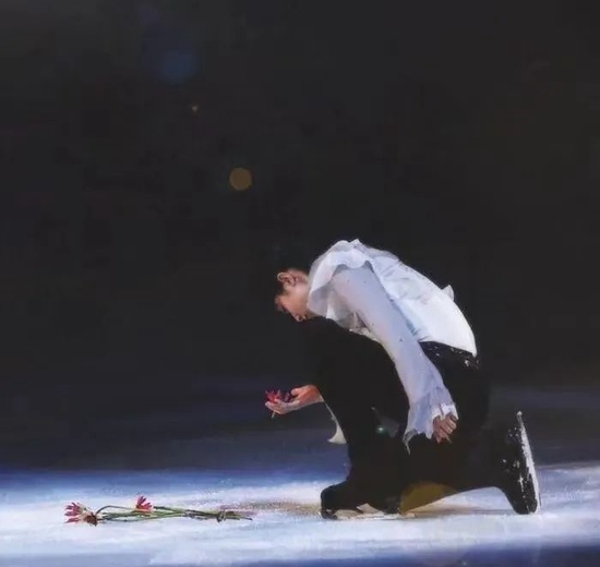 羽生结弦在表演赛上亲吻冰面
