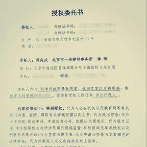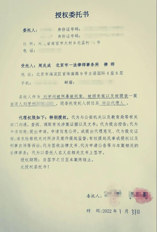 根据网络流传的相关授权委托书显示:刘学州被网暴致死案、被拐卖案以及被猥亵案,特别授权北京市一法律师事务所律师周兆成担任诉讼代理人。