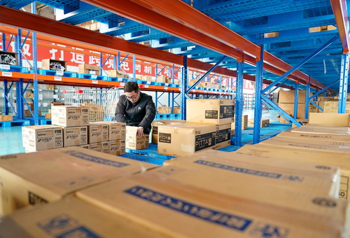 2019年12月20日,在唐山京唐港区保税物流中心,跨境电商企业工作人员在整理货物。新华社记者 杨世尧 摄