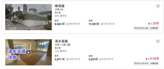 另一套位于浅水湾道的建筑面积为5051呎(约469.25平方米)的洋房,售价6.98亿港元(约人民币5.67亿元),折合单价120.83万元/平方米。