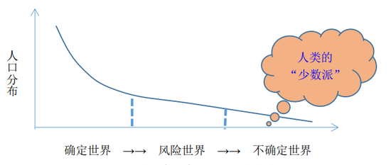 这也意味着,看起来大家生活在同一个世界里,实际上却生活在不同的小世界里,正如鲁迅曾言“人类的悲欢并不相通”。企业家就是那些在风险世界、尤其是不确定性世界中生存的人,与他们同类的还有很多科学家、哲学家、政治家、艺术家、文学家等,他们是“同类”,也是人类中勇于探索、创造变化、带来革新的“少数派”(图1)。