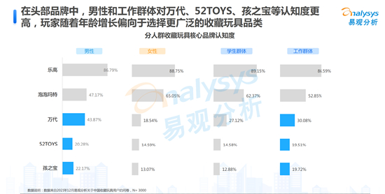 以品牌力方面为例,目前国内男性消费者对万代、孩之宝、52TOYS等品牌的认知度远高于女性消费者。