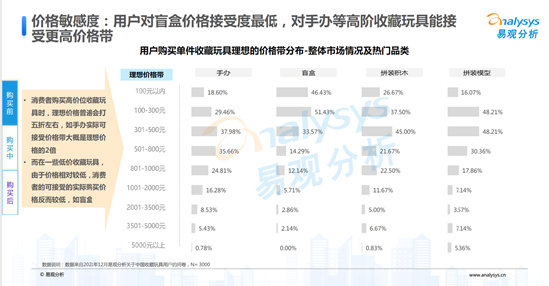 此外,针对不同品类的收藏玩具,用户对价格的敏感度也截然不同。其中,消费者对盲盒的价格敏感度最高,随着价格提升,对盲盒的购买意愿降低,反之对手办、拼装积木、拼装模型产品的接受度更高。