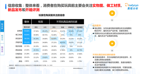 报告认为,虽然线下渠道是众多收藏玩具用户“入坑”的主要渠道。但是玩家在购买前,主要通过线上平台发布的信息对收藏玩具进行了解,实物图、做工材质、新品发布和开箱评测都是他们获取产品信息时关注的内容。