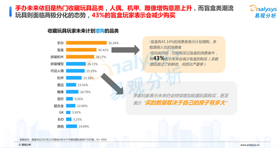 调研数据显示,当下国内收藏玩具用户的人均年消费为2200元,变形、手办等产品的人均消费额较高。但有43%的玩家表示未来会减少购买盲盒产品,手办则仍然是未来热门的收藏玩具品类,人偶、机甲、雕像的用户购买意愿也呈上升趋势。