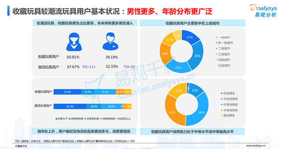 目前收藏玩具核心消费者中,男、女用户比例近4:6,与潮流玩具近7成女性消费者相比,男性消费者有所增加。且随着年龄增长,收藏玩具消费者购买的品类更加多元,消费力更强。