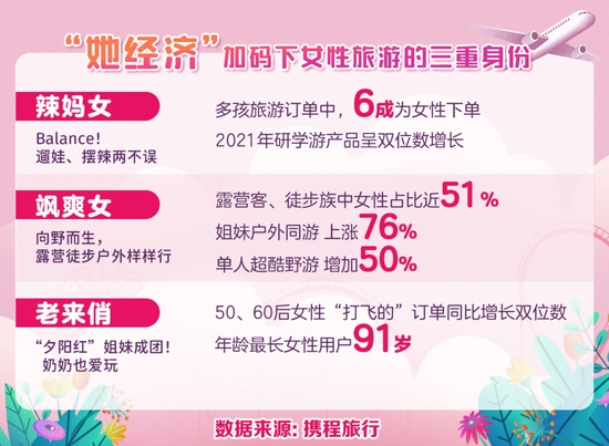 能顶半边天的女性,也扛起了旅游消费的半边江山。3月7日,携程发布《2022“她旅途”消费报告》,报告显示,2021年,携程女性用户人均旅游订单较2020年增长11%。同程旅行平台大数据则显示,近七成旅行消费的决策由女性做主。