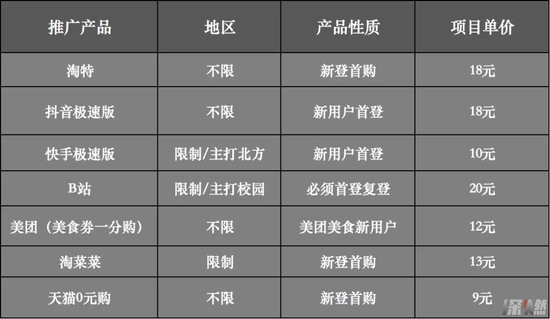 目前市面上主推的APP拉新奖励价格(注:深燃根据受访对象口述及拉新群信息整理,不同等级团队价格不完全一致,仅供参考)制图 / 深燃