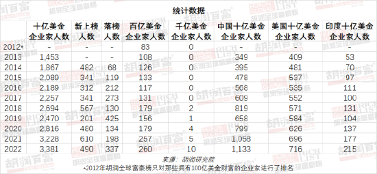 胡润百富董事长兼首席调研官胡润表示:“虽然疫情还没有结束,加上俄乌战争的影响,今年落榜了300多人,相当于一天一人,但随着全球数字经济的发展,加上科技创新,以及通货膨胀,还是有近500人新上榜,全球十亿美金企业家总人数再创历史新高,达到近3,400人。”