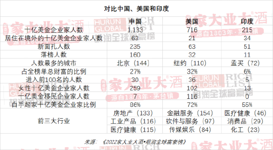 中国的十亿美金企业家人数继续超过美国,增加了75人,达到1,133人。美国排在第二位,有716位十亿美金企业家,增加了20位。中国和美国拥有世界上55%的十亿美金企业家。印度增加了38位,巩固了第三名的地位,而英国超过德国成为第四名。在卢布贬值和俄乌战争以来受到制裁的背景下,俄罗斯下降一位,至第八名,有72位十亿美金企业家,减少了13人,在所有国家中减少最多。