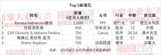 今年榜单上排名最靠前的新面孔是Renata Kellnerova,财富1,000亿元,她从已故丈夫Petr Kellner手中继承了捷克最大的保险公司;其次是来自中国的运动鞋制造商华利实业74岁的张聪渊及其家族,财富900亿元。新面孔前五名中也包括比尔·盖茨的前妻梅琳达·弗伦奇·盖茨,财富700亿元。